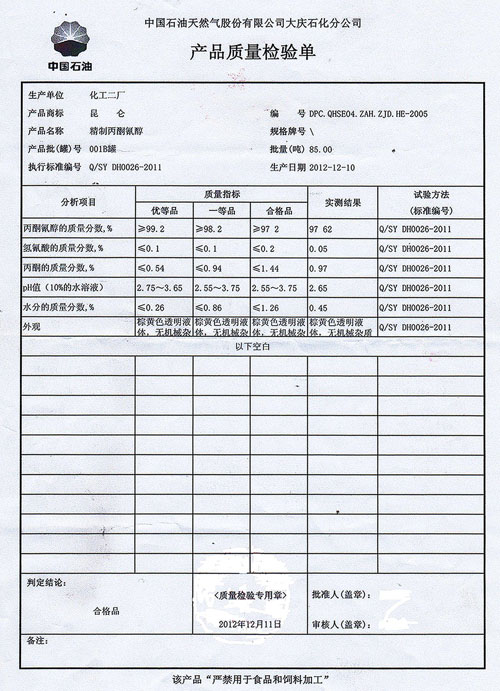 本標(biāo)準(zhǔn)適用于丙酮與氫氰酸反應(yīng)制得的精制丙酮氰醇。
